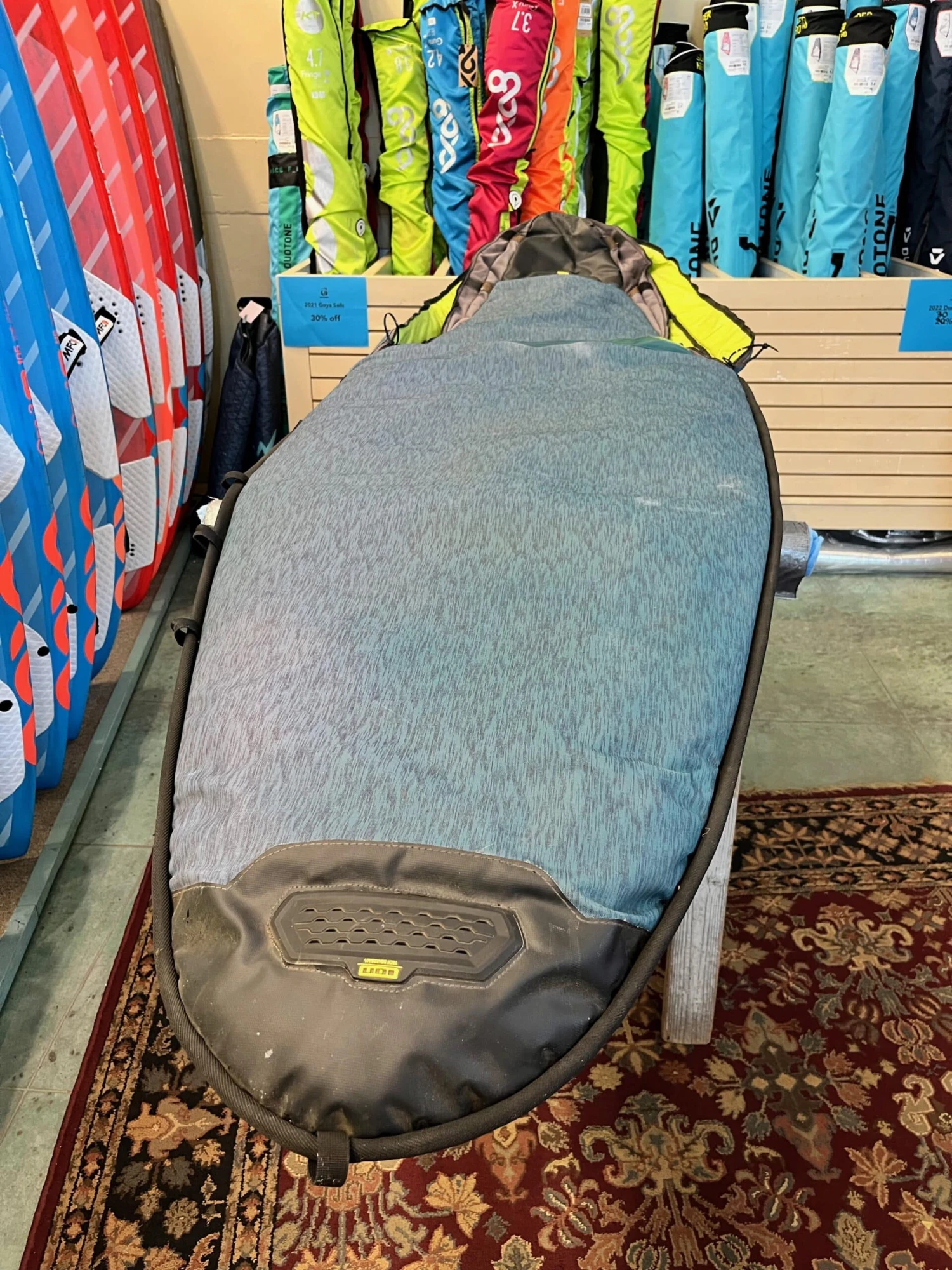 “B+” condition. A few cosmetic scuffs and scratches, but overall solid with no dings whatsoever. At 15 pounds with straps and fins, it’s as light as the day it was born. A great shape to plane early, rig small, and rip tight turns! Ships by quote.
